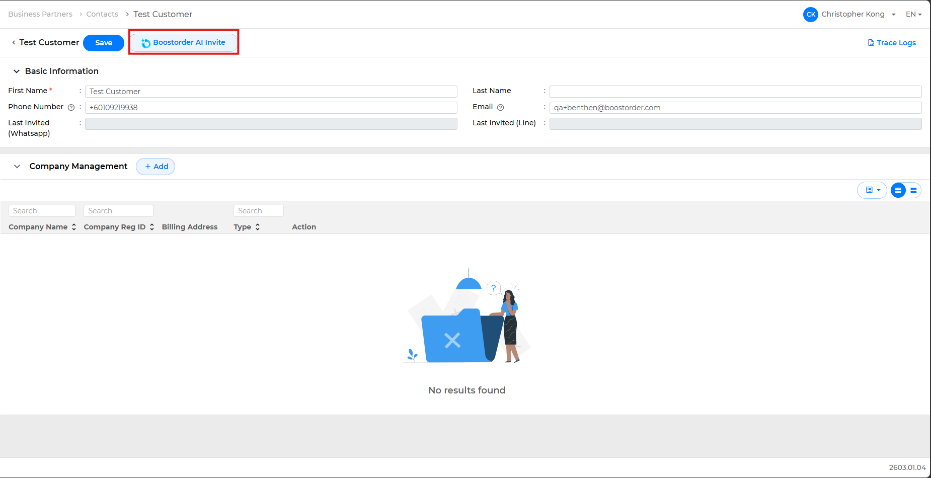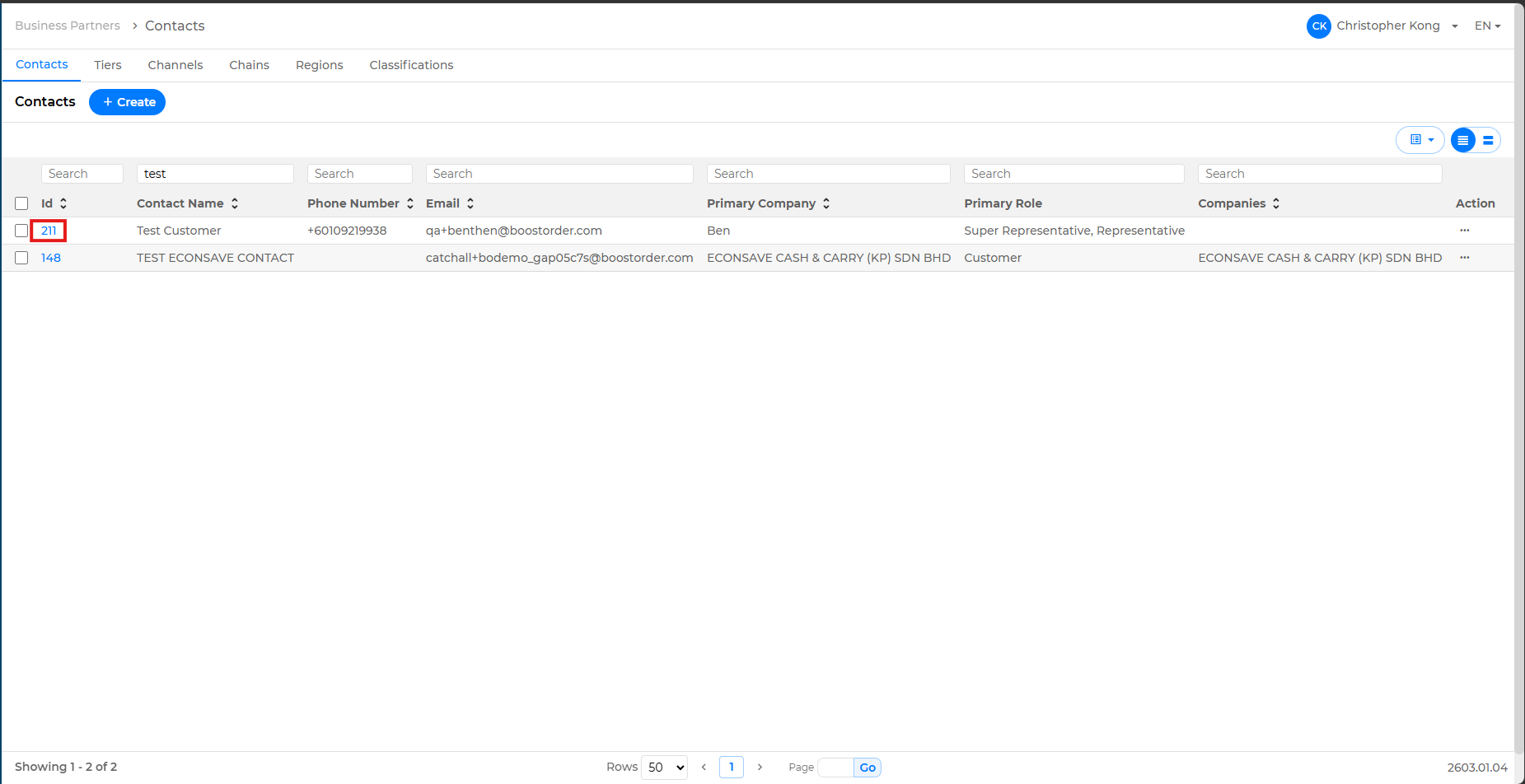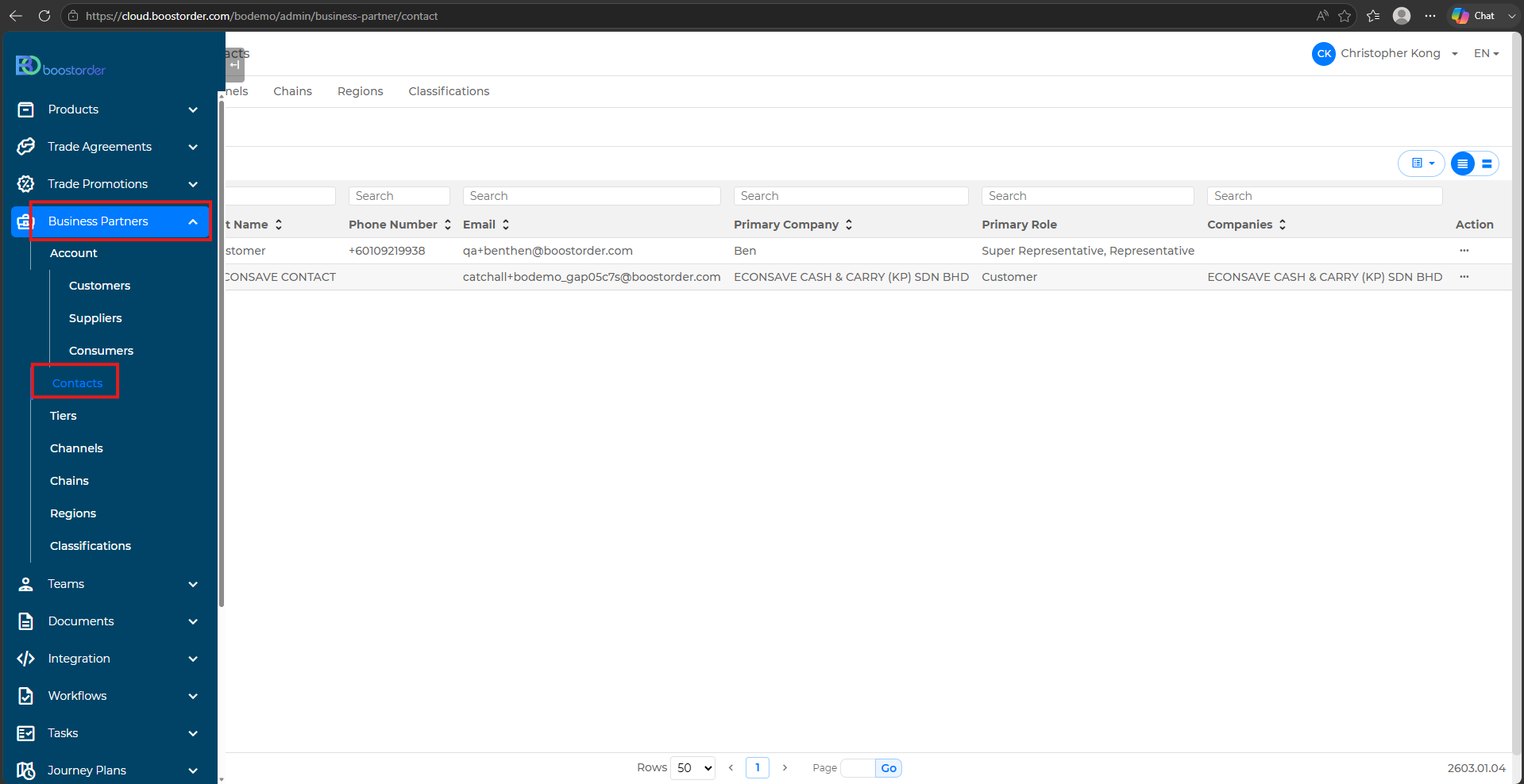 - Go to the Business Partner > Contacts page.